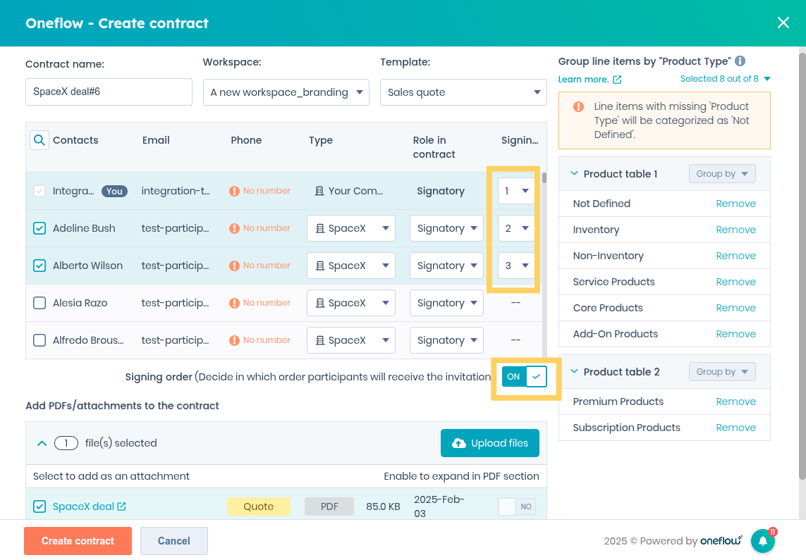 - Once enabled, a Signing order column will appear, allowing you to assign a specific sequence number to each participant.