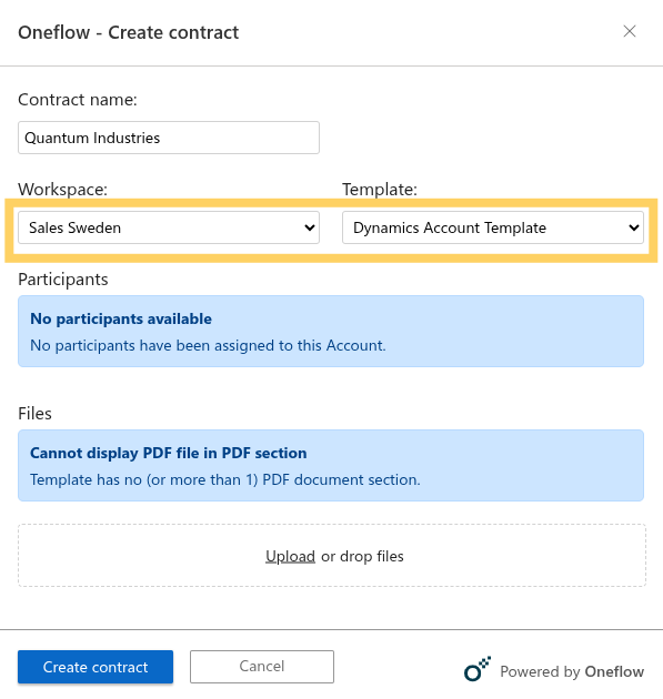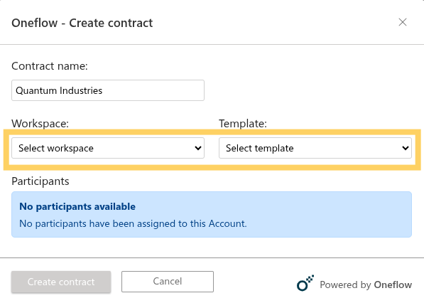 - For each contract you can choose, which Oneflow workspace to use and which Oneflow contract template to use.