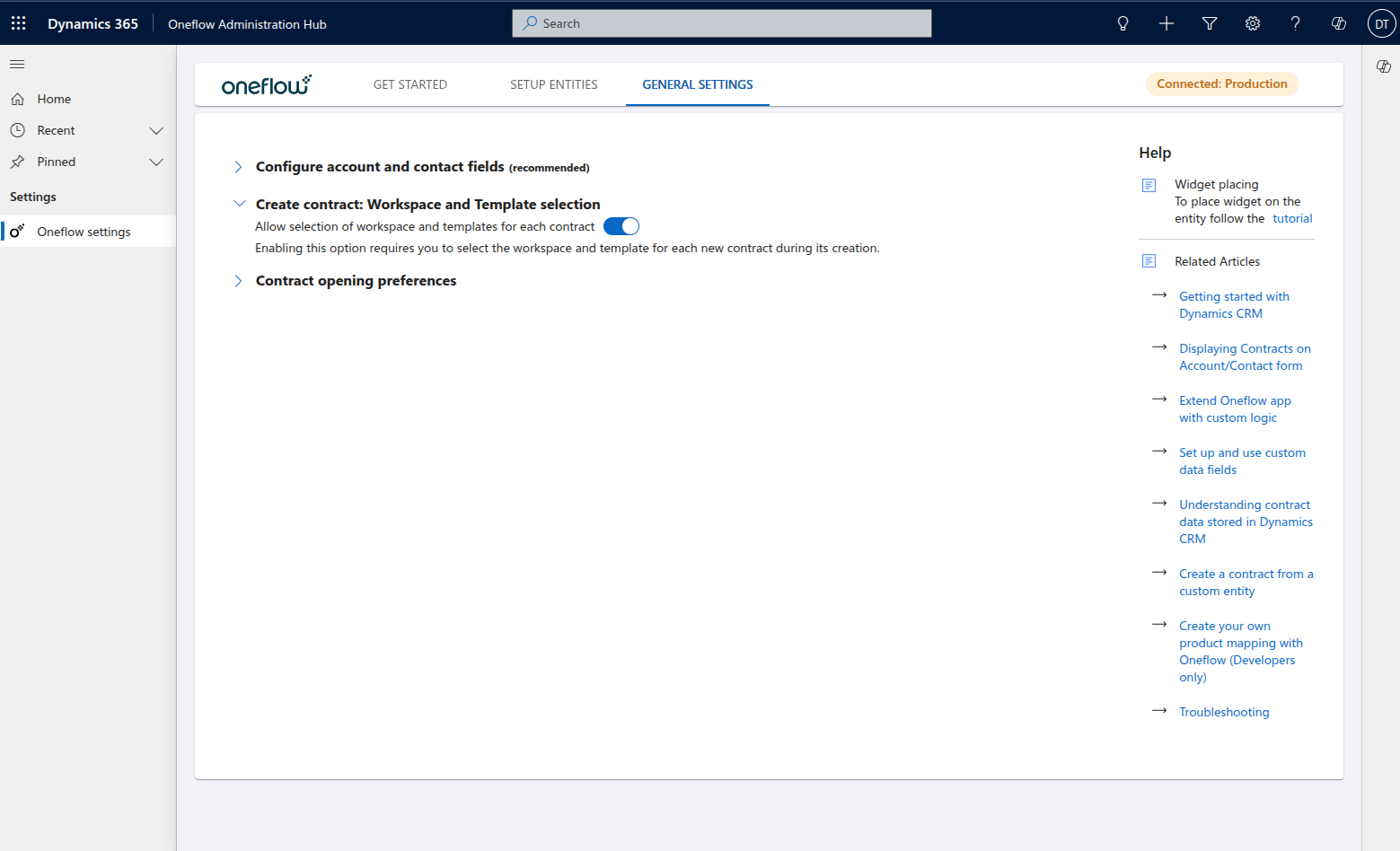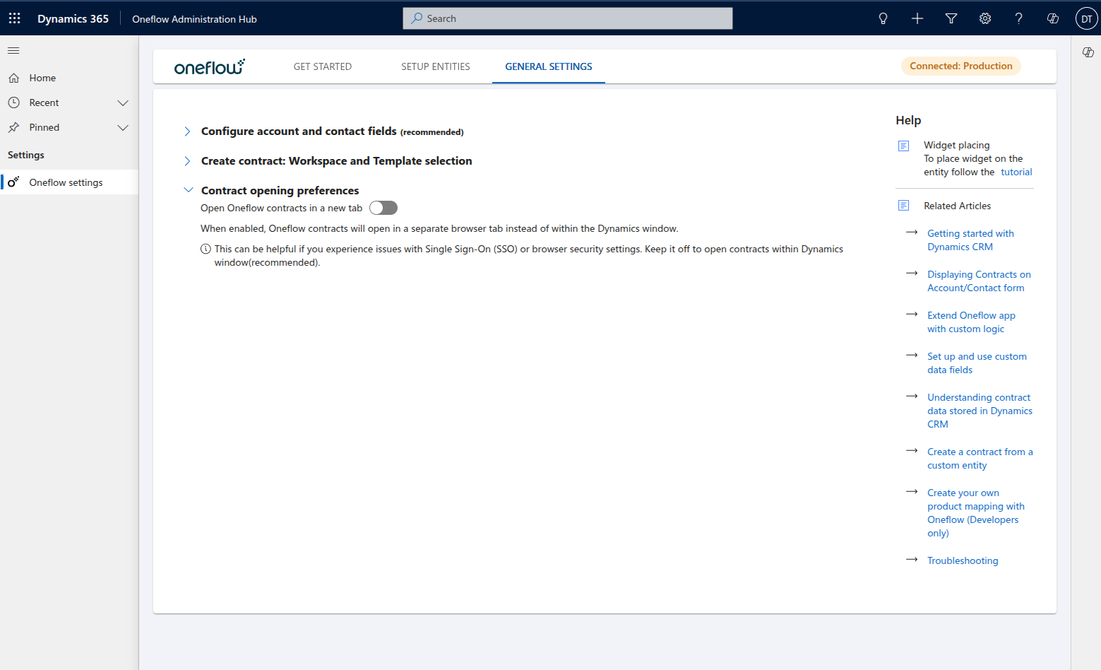 The General settings page lets you configure how Oneflow works within Microsoft Dynamics 365.