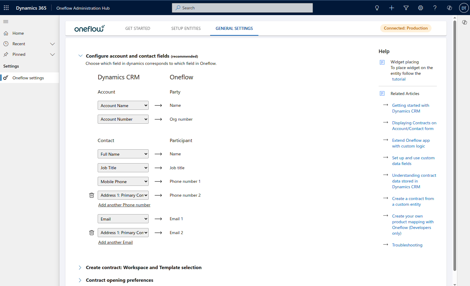 - For instance, Oneflow’s “Org. number” field can be mapped to the Account Number field of the Account entity in Dynamics CRM.