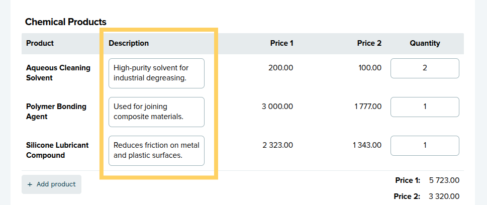 1. Product description column (automatic):