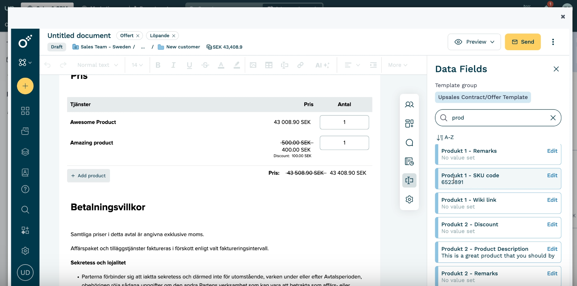 When you create a Oneflow document from Upsales with a template containing data fields or a product table, information from your opportunity, company, and contact records are automatically transferred to populate the document. This includes standard fields in Upsales as well as custom fields for products.