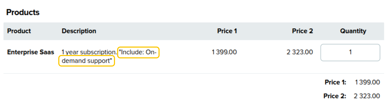 - If checked: Only the name of the checkbox field is added (appended) to the product description. For example, if you have a custom checkbox field named "Include: On-demand support" and it is checked in Upsales, then the "Include: On-demand support" label will appear in the description column of Oneflow’s product table. The explicit value (`true`) is not displayed.